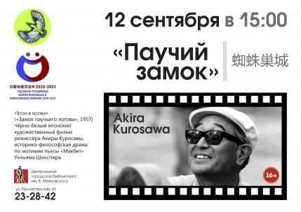 Курганское областное отделение Общества «Россия – Япония» 12 сентября в 15:00 приглашает всех любителей японского кино в библиотеку Маяковского на просмотр фильма известного японского режиссера Акиры Куросава «Паучий замок» (1957 г.).