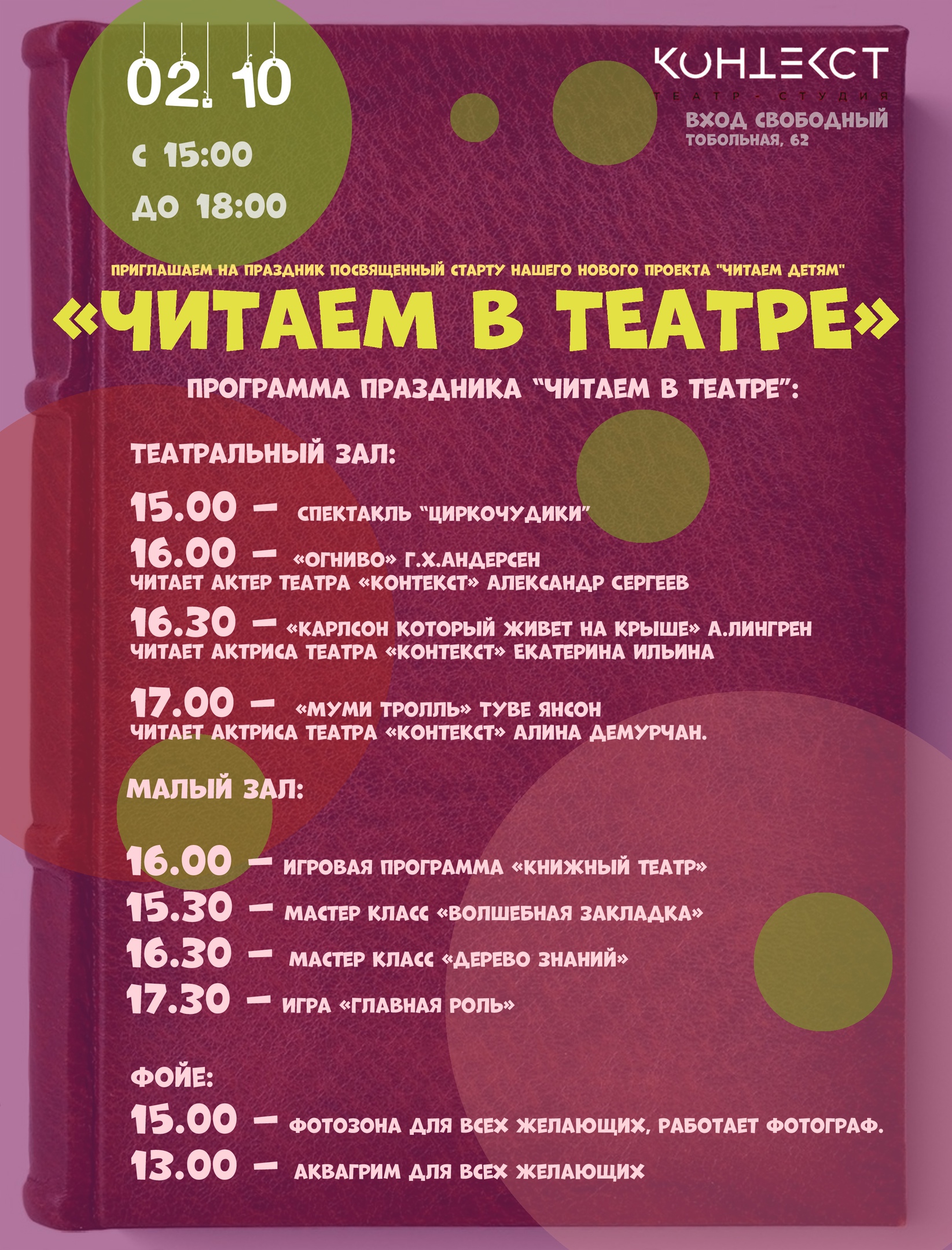 Будет чтение книг актерами Театра, спектакль, мастер-классы, аквагрим и фотозона, игры и веселье.