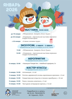 Гостей ждут вдохновляющие выставки, уютные экскурсии, тёплые семейные праздники и творческие мастер-классы для детей и взрослых.