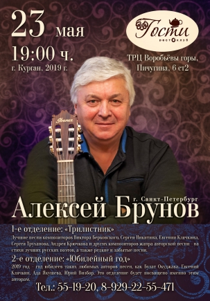 Здравствуйте, дорогие друзья! А у меня для вас замечательная новость - 23 мая в рестоклубе "Гости" выступит великолепный исполнитель классической авторской песни - Алексей Брунов, г. Санкт-Петербург.