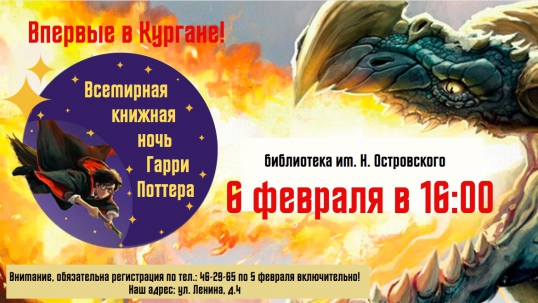 6 февраля в Центральной детской библиотеке им. Н. Островского впервые состоится Всемирная акция «Книжная ночь Гарри Поттера» от британского издательства «Bloomsbury». В 2020 году темой стал «Турнир трех волшебников». Приглашаем всех любителей прекрасных историй о мальчике, который выжил, окунуться в атмосферу волшебства.