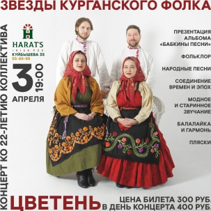 В Харатс Паб состоится концерт ко Дню рождения ансамбля «Цветень». 22 года. Старинные и популярные народные песни, современная музыка, гармонь и балалайка. соединение несоединимого. Короче говоря, лучшая этнодискотека Зауралья.