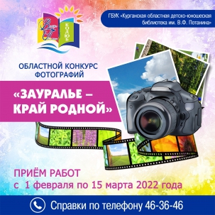 С 1 февраля по 15 марта 2022 года Курганская областная детско-юношеская библиотека им. В.Ф. Потанина проводит областной конкурс фотографий «Зауралье - край родной». Конкурс проводится в рамках проведения мероприятий, посвященных 79-ой годовщине образования Курганской области.