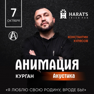 7 октября в Harat`s Irish Pub состоится акустический концерт Кости Кулясова - лидера группы «АнимациЯ», вместе с легендарным рок-баянистом Рушаном Аюповым и нашим харизматичным гитаристом Алексеем Салеевым! Мы услышим полтора десятка ломовейших хитов и самые новые песни!