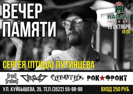 15 октября – проводим воскресный вечер памяти Сергея Путинцева (Птица) Рок-команды соберутся вместе. Будут песни. Будут воспоминания. Будет особенная атмосфера. Не пропусти это событие!
