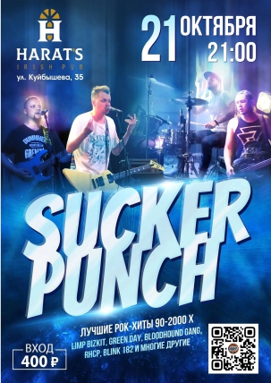 В субботу, 21 октября встречаем гостей из солнечного Екатеринбурга. Кавер-группа "Sucker Punch", исполняющая рок и альтернативу 90х- начала 2000х порадует на своём мощном концерте лучшие хиты золотой эпохи MTV Russia: Limp Bizkit, RHCP, Green Day, Korn... и др.