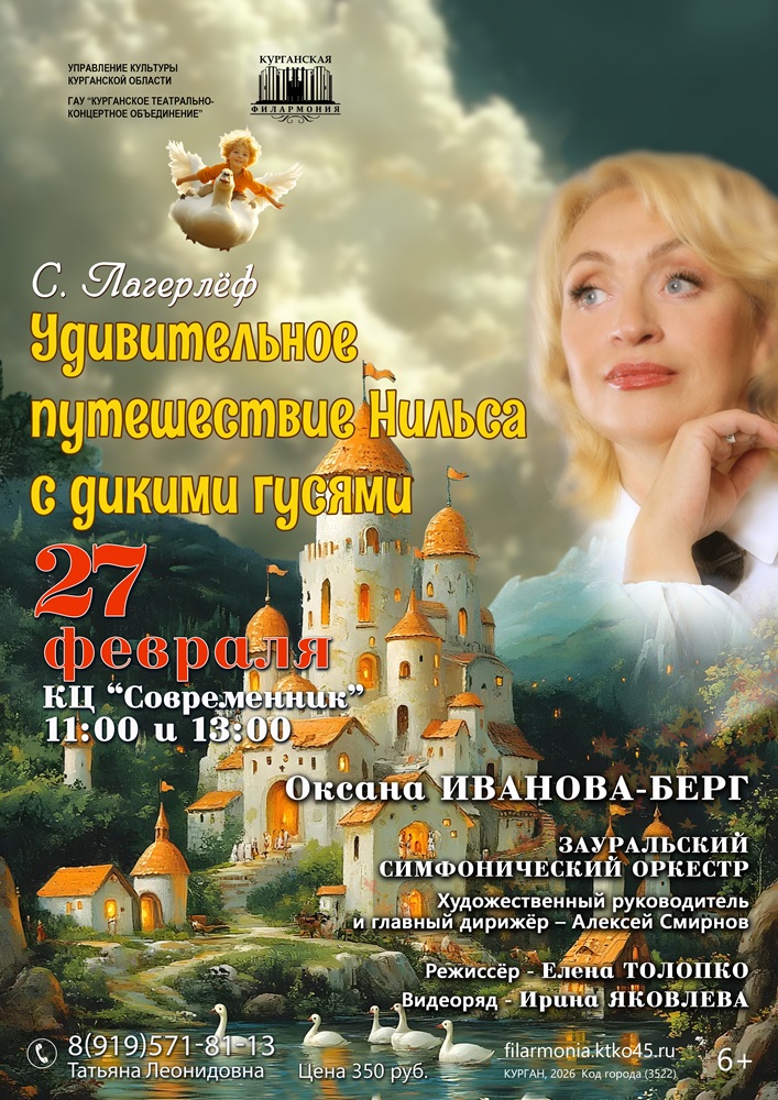 В исполнении солистки Курганской филармонии Оксаны Ивановой-Берг и Зауральского симфонического оркестра прозвучит литературно-музыкальная композиция по мотивам сказки Сельмы Лагерлёф.